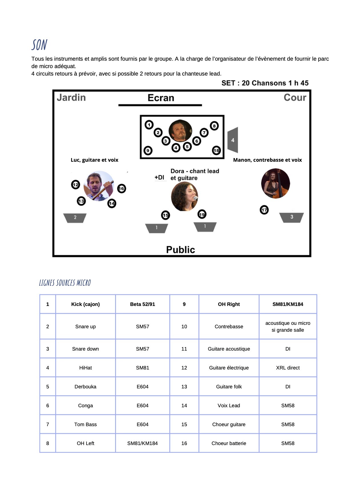 - Espace scénique minimum 6 m. x 8 m.`si duo ou 8 m X 10 m pour quatuor