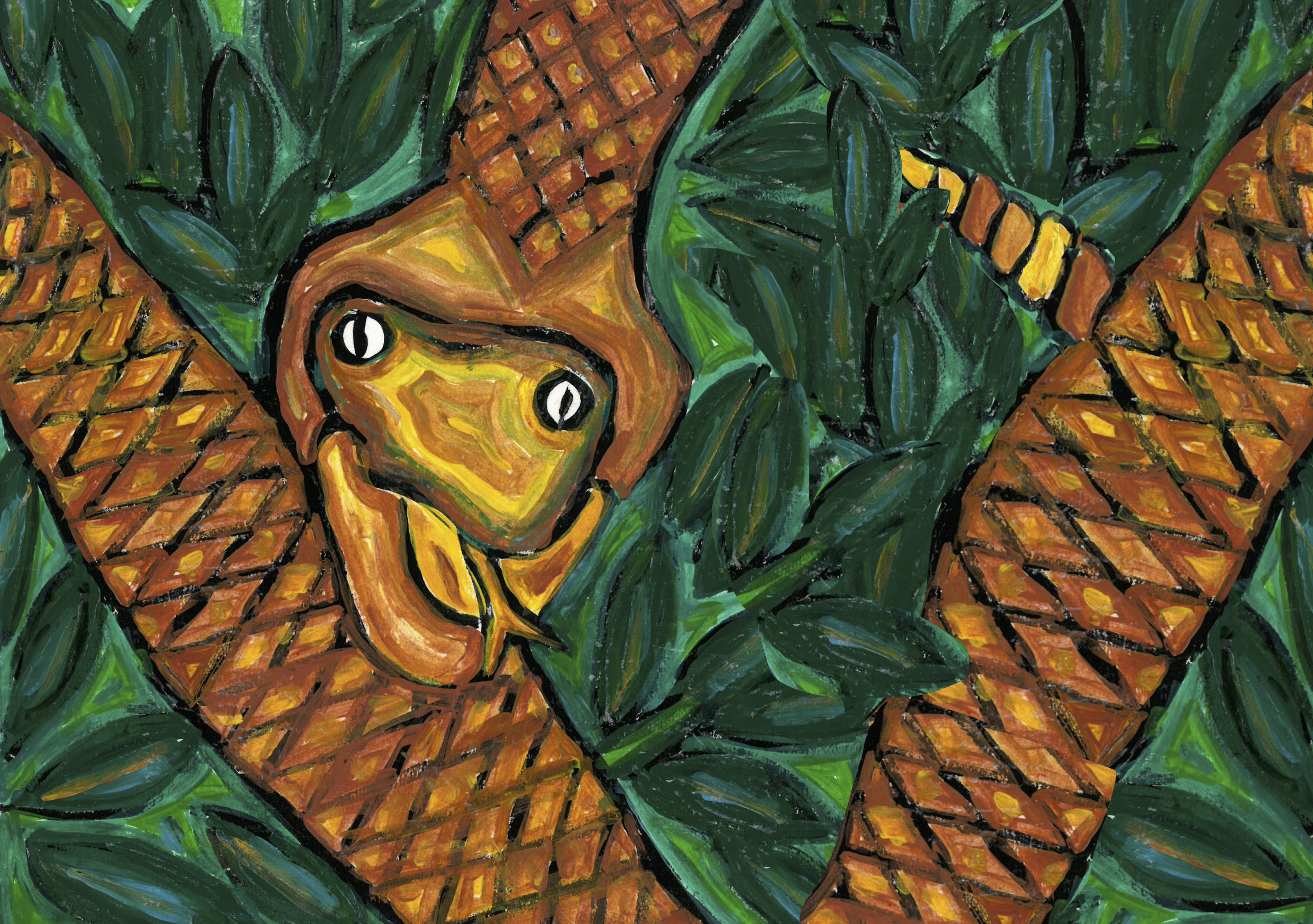 Serpiente cosmica est un hommage au livre homonyme de Jéremy Narby. C’est aussi une façon de remercier la plante maitre sacrée qui m’a guerie d’une maladie circulatoire cronique. C’est également un hommage aux connaissances indigènes de l’Amazonie et les personnes qui la pratiquent.